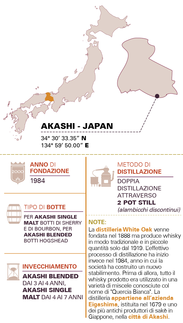 ZONA PRODUTTIVAAkashi - White Oak Distillery MATERIA PRIMALe prugne vengono fatte macerare nel Shochu (acquavite giapponese). Il tutto poi è arricchito da Whisky e zucchero. COLOREAmbra scuro PROFUMOAl naso spiccano note di prugna, miele e mandorle. SAPOREAl palato è corposo, con in evidenza prugna e mela candita.
