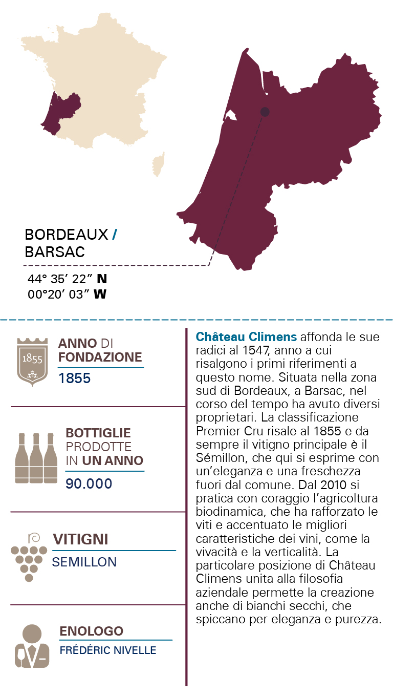 TIPOLOGIAAOC Bordeaux Blanc ZONA PRODUTTIVABarsac VITIGNO100% Sémillon TIPOLOGIA DEL TERRENOSabbie rosse argillose su base e calcare ETÀ DEI VIGNETI15 anni VINIFICAZIONEVinificazione in cemento COLOREGiallo paglierino carico PROFUMOAl naso è fresco e intenso, con una bella mineralità sullo sfondo ABBINAMENTIPerfetto in abbinamento a carni bianche e ai frutti di mare SAPOREAl palato è rotondo e di buon impatto, con una fresca acidità che accompagna un sorso lungo INVECCHIAMENTOAffinamento di 9 mesi.
