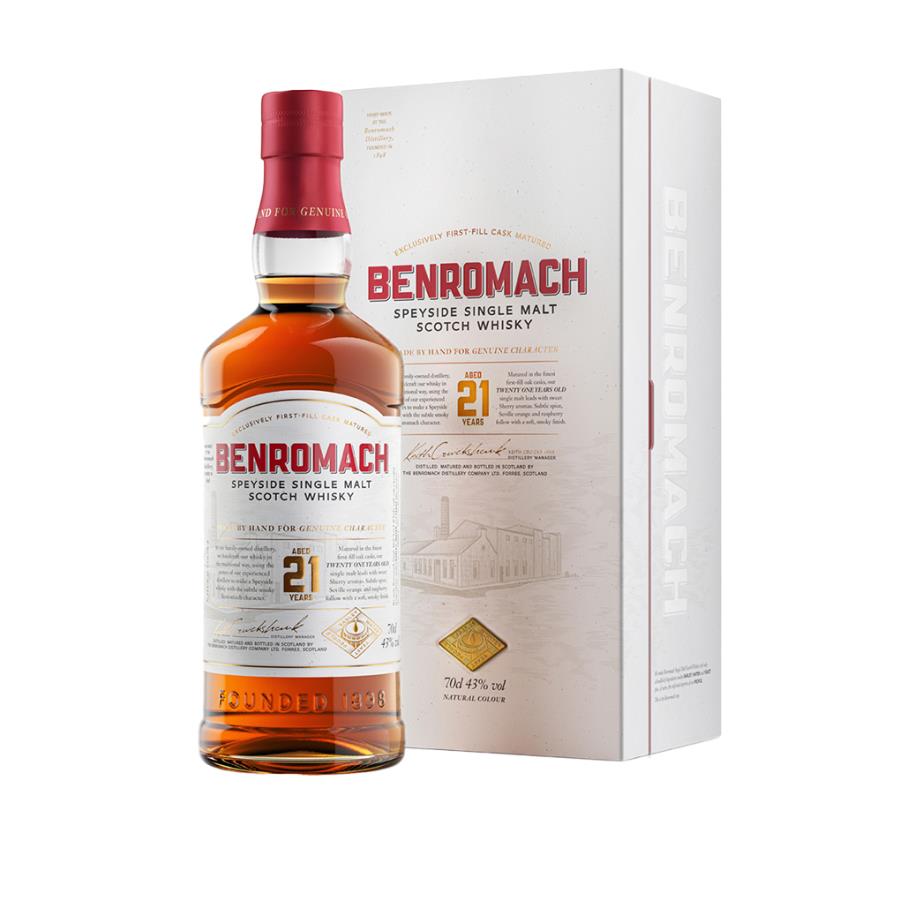 ZONA PRODUTTIVAForres MATERIA PRIMAOrzo, acqua e lievito DISTILLAZIONEUtilizzando i migliori ingredienti naturali, i distillatori coordinano ogni singolo momento del processo di distillazione; ogni botte viene riempita, pesata e marchiata manualmente prima di essere riposta per molti anni nei tradizionali magazzini “dunnage” per la fase di maturazione. COLOREAmbrato dorato. PROFUMODolce di Sherry con note agrumate, zenzero e quercia, accompagnate da cenni affumicati. SAPOREInizialmente dolce con note di pepenero, seguite da aranciadi Siviglia e lampone che conducono poi a una sensazione di mela cotta e spezie. Finale morbido e affumicato. NOTELadistilleria Benromach è stata per anni la più piccola tra quelle tutt’oggi funzionanti nello Speyside. Produce whisky con metodi fedeli alla tradizione. Solo il malto più pregiato e la più pura acqua, vengono usati. IlBenromach Organic è il primo single malt whisky ad essere stato pienamentec ertificato dalla “SoilAssociation” britannica. L’intero processo produttivo e l’invecchiamento sono certificati secondo i rigorosi “OrganicStandard”. INVECCHIAMENTO21 anni in botti che hanno contenuto in precedenza Bourbon e Sherry.