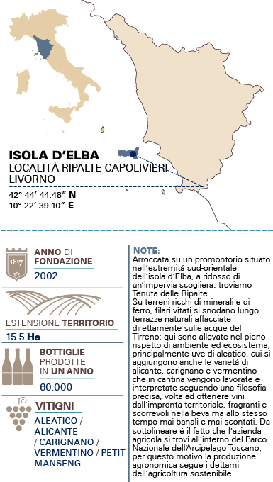 TIPOLOGIAVS Vino Spumante ZONA PRODUTTIVACapoliveri - Isola D'Elba VITIGNO100% Aleatico TIPOLOGIA DEL TERRENOGranito metamorfico VINIFICAZIONEIl vino viene prodotto interamente con uve Aleatico, raccolte verso la metà di agosto. La spumantizzazione segue il metodo Charmat. Le uve, quindi, subiscono una soffice pressatura per ottenere la base spumante, che viene poi rifermentata. In fase di imbottigliamento la liqueur d’expedition è costituita dall’Aleatico Passito. COLOREColore rosa tenue. PROFUMOProfumi primari, fiori e frutta con un ricordo di macchia mediterranea. ABBINAMENTIOltre ai classici abbinamenti con la cucina marinara e rustica isolana, il Brut Rosato delle Ripalte trova nei crostacei; nei frutti di mare un legame ideale. Molto gradevole come aperitivo o per accompagnare tutto il pasto. SAPOREAl palato: molto equilibrato e fresco, armonico e delicatamente fruttato.