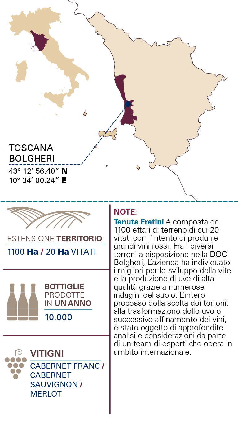 TIPOLOGIADOC Bolgheri Superiore ZONA PRODUTTIVAComune di Donoratico frazione Castagneto Carducci, Livorno. VITIGNO80% Cabernet Franc, 20% Cabernet Sauvignon TIPOLOGIA DEL TERRENORocce sedimentarie costituite da calcari, marmi, argilliti con intercalazioni di arenarie e rocce silicee. VINIFICAZIONELe uve vengono raccolte a mano e selezionate in cantina. Gli acini fermentano in vasche tronco-coniche di acciaio inox a temperatura controllata. La fermentazione avviene con lieviti spontanei. SISTEMA DI ALLEVAMENTOGuyot. COLORERosso porpora con riflessi violacei. PROFUMOAl naso il bouquet è ampio, con chiari rimandi fruttati che si aprono su note di erbe mediterranee che ne scalfiscono la personalità. ABBINAMENTISi sposa con piatti robusti e saporiti, come selvaggina marinata e arrosto di cinghiale, faraona brasata o anatra. Ottimo accanto a arrosti di vitello o suino conditi con un mix di erbe mediterranee, tra cui alloro, bacche di ginepro, rosmarino e salvia, che esalteranno le sue note aromatiche complesse. La sua complessità si esalta anche accanto a formaggi stagionati e ricchi come il pecorino invecchiato. SAPOREAl palato è strutturato, con un tratto balsamico rinfrescante che fa di lui un vino di potenza senza pesantezza. INVECCHIAMENTOUn invecchiamento in barrique di 2° e 3° passaggio per 12 mesi completa l'affinamento del vino.